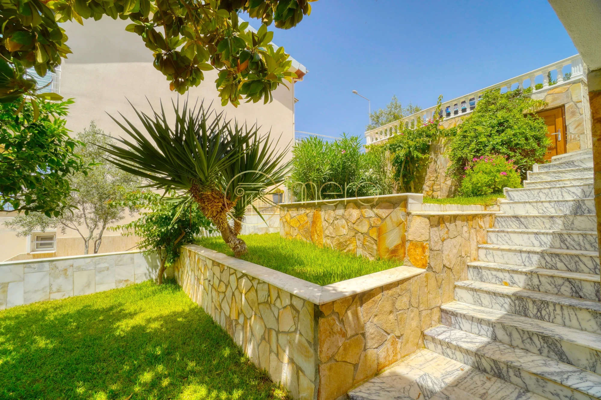 Bahçede nar, mandalina, defne, manolya, asma ağaçları ve renkli peyzaj bitkileri